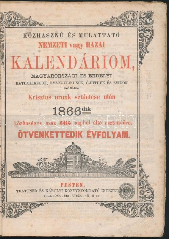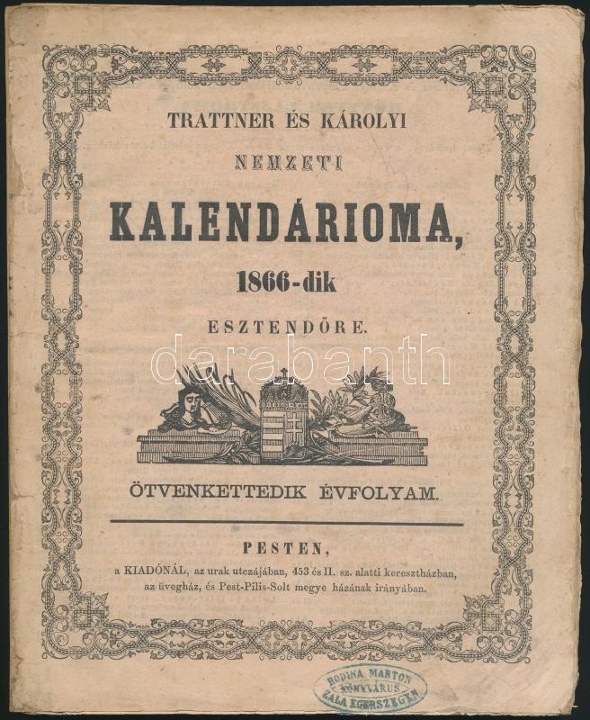 1866 Trattner és Károlyi Nemzeti Kalendáriuma, 1866-dik esztendöre. Ötvenkettedik évfolyam. Pest, Trattner Károlyi. Kiadói papírkötés, javított gerinccel, osztrák naptárbélyeg pecséttel a címlapon.