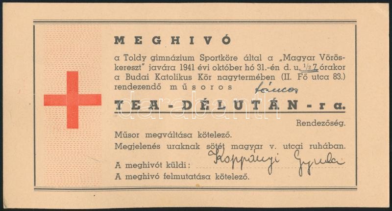 Beschreibung: 1941 Meghívó vöröskeresztes teadélutánra, bélyegzőkkel