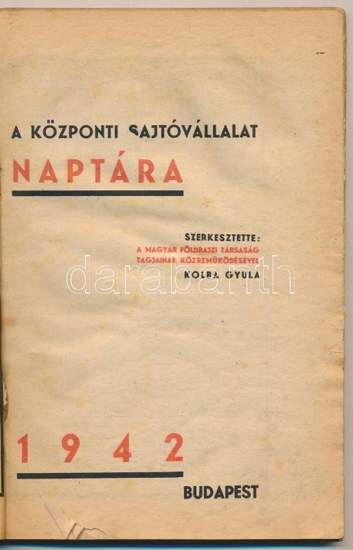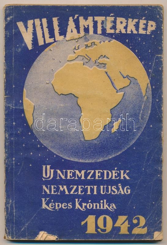 1942 Villámtérkép. Uj Nemzedék. Nemzeti Újság. Képes Krónika. Központ Sajtóvállalat Naptára. Szerk.: Kolba Gyula. Bp., Központi Sajtóvállalat. Papírkötésben, kissé viseltes állapotban, kopottas borítóval, szakadásokkal.