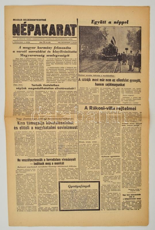 Beschreibung: 1956 A Népakarat, a Magyar Szabad Szakszervezetek Országos Szövetségének Lapja november 2-diki száma, a forradalom híreivel