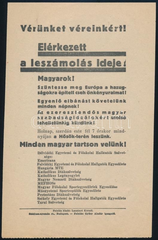 cca 1920 "Vérünket véreinkért! Elérkezett a leszámolás ideje!", irrede... https://www.darabanth.com/de/296-Fernauktion/296.0/Andere-Sammelgebiete/Drucksachen~27/cca-1920-Verunket-vereinkert-Elerkezett-a-leszamolas-ideje-irredenta-roplap~II1570570