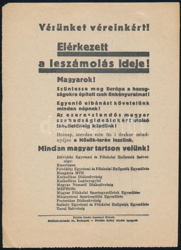 cca 1920 "Vérünket véreinkért! Elérkezett a leszámolás ideje!", irrede... https://www.darabanth.com/de/296-Fernauktion/296.0/Andere-Sammelgebiete/Drucksachen~27/cca-1920-Verunket-vereinkert-Elerkezett-a-leszamolas-ideje-irredenta-roplap~II1570571