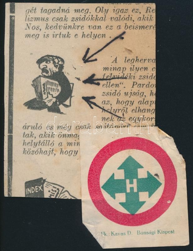 Beschreibung: cca 1944 Nyilaskeresztes matrica antiszemita újságkivágáson