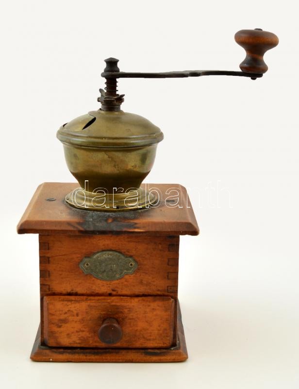 Beschreibung: Fa, réz és fém elemekből álló kávédaráló, jelzett, jó állapotban, 23x13x13 cm