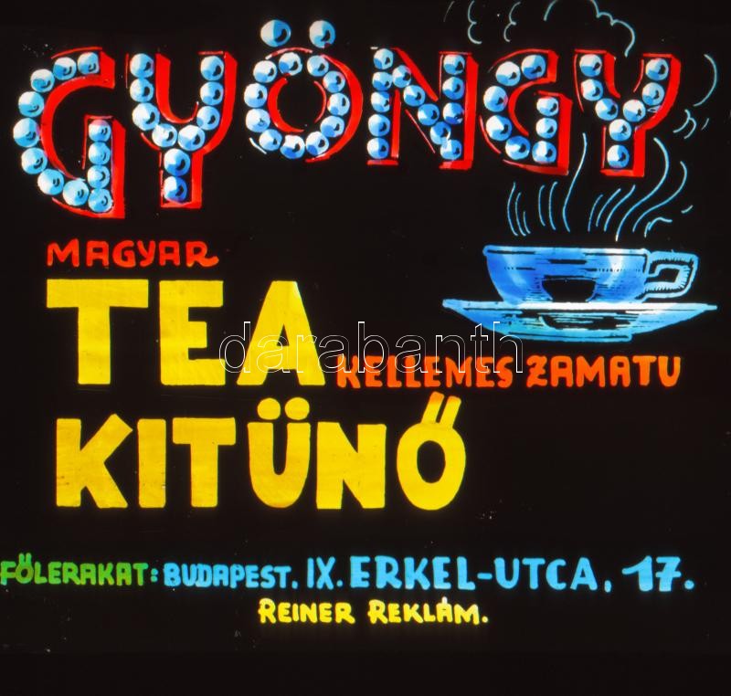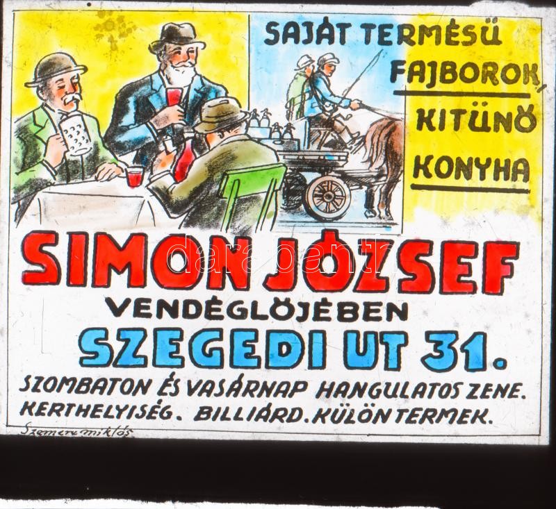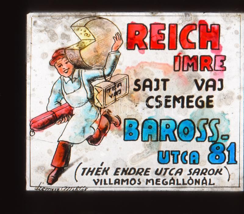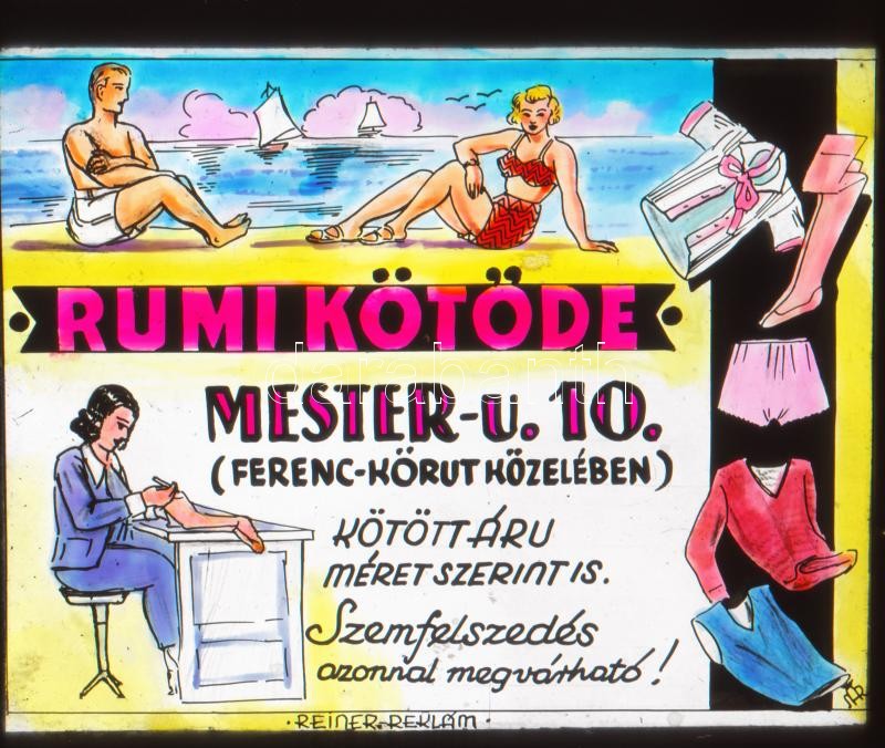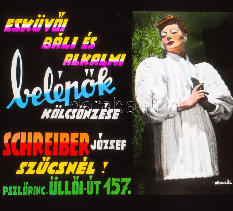 cca 1947 Fekete György (1904-1990) budapesti fényképész reklámgrafikái különféle szolgáltatásokról, termékekről, ezekről készített mozikban vetíthető üveglemez diapozitív képeket, az eladásra kínált tétel 13 db színezett üveglemezt tartalmaz, 4,5x6 cm