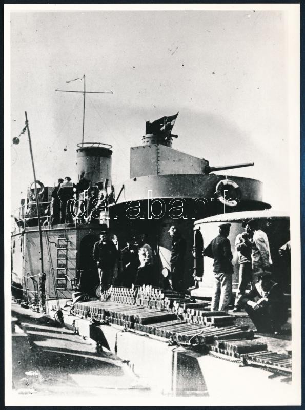 Beschreibung: A Kőrös monitor, a Dunai Flottila hajója ágyúlövedékekkel a fedélzeten, az 1980-as években eredeti negatívról előhívott másolat, 18x13 cm