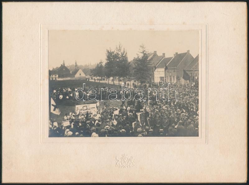 cca 1920 Eecke, 2 db korabeli fotó, kartonra kasírozva: első világháborús emlékmű a belga-francia határnál, tüzérségi ágyúkkal, háttérben a lerombolt templom, emlékmű avatási ünnepsége, képméret: 10x14,5 és 12x17 cm / cca 1920 Eecke, 2 photos, WWI memorial, guns, destroyed church, 10x14,5 & 12x17 cm