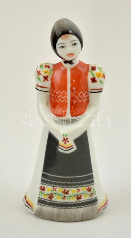 Beschreibung: Hollóházi porcelán népviseletes lányka, kézzel festett, jelzett, kis kopással, m: 10 cm.