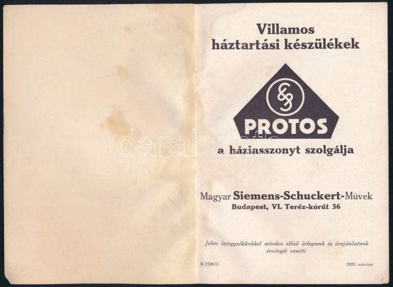 1929 Protos villamos háztartási készülékek, képes árjegyzék, kissé fol... https://www.darabanth.com/de/296-Fernauktion/296.0/Andere-Sammelgebiete/Werbungen~20/1929-Protos-villamos-haztartasi-keszulekek-kepes-arjegyzek-kisse-foltos-papirkotesben~II1577297