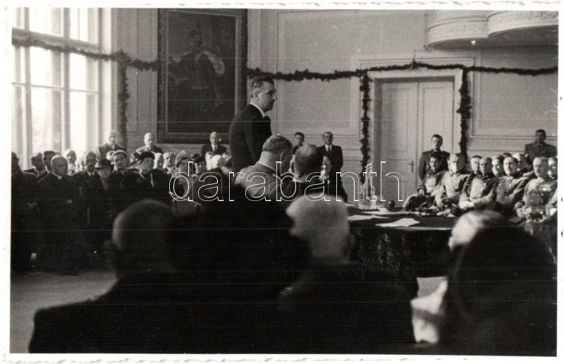 1940 Nagyszalonta, Salonta; Országzászló avatás. Dr. Kiss Ferenc anatómia professzor, a Magyarországi Nagyszalonta Egyesület elnöke beszédet mond a városházán / Hungarian Flag inauguration. President of the Hungarian Salonta Association giving his speech at the town hall. Zsák Jenő Jászberényi photo