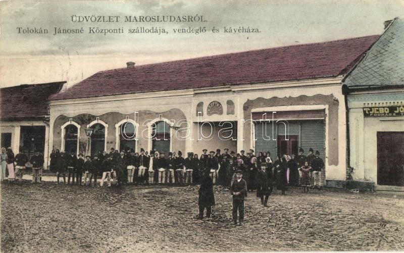 Marosludas, Ludus; utcakép, Tolokán Jánsoné Központi szállodája, vendéglője és kávéháza, Tjebo József fodrász üzlete, csoportkép. Glück J. kiadása / street view with hotel, restaurant and cafe, hairdresser, group picture
