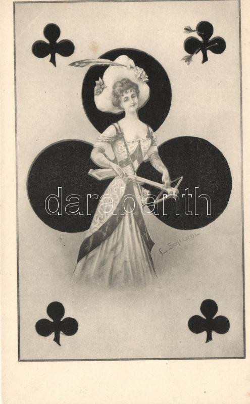 Beschreibung: Francia kártyás művészlap, hölgy számszeríjjal / French card suit, lady with crossbow s: E. Schiendl