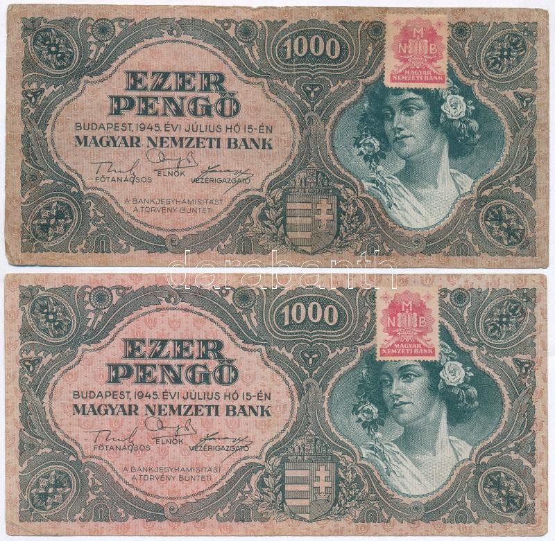 1945. 1000P betűhibás "MNB" bélyeggel (2x) T:III,III- https://www.darabanth.com/de/296-Fernauktion/296.0/Numismatik/Ungarische-Banknoten~300022/1945-1000P-betuhibas-MNB-belyeggel-2x-TIII-III-~II1577413
