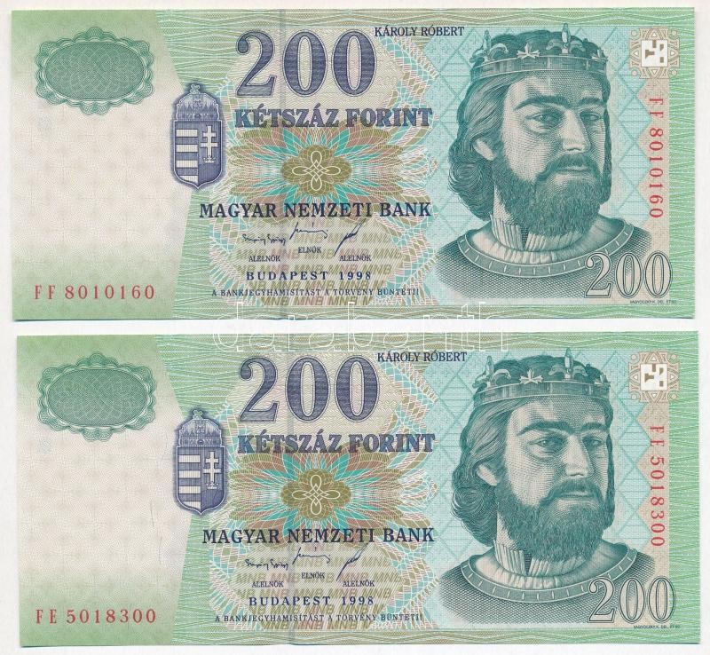 1998. 200Ft "FE" + 200Ft "FF" T:I https://www.darabanth.com/de/296-Fernauktion/296.0/Numismatik/Ungarische-Banknoten~300022/1998-200Ft-FE-plus-200Ft-FF-TI~II1577270