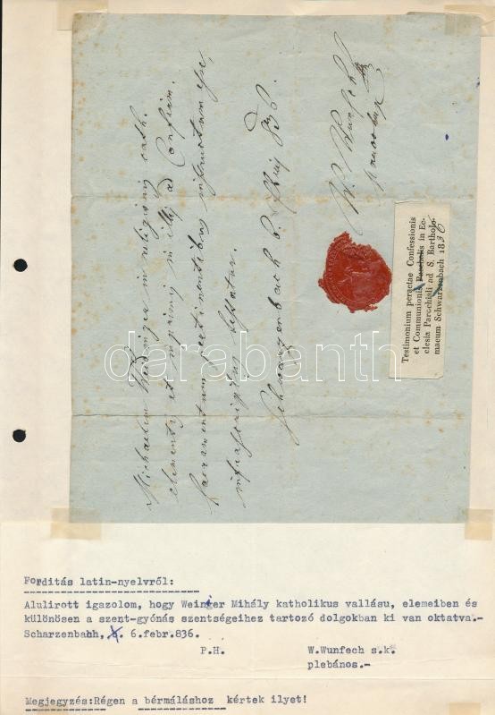 1836 Schwarzenbach, latin nyelvű bérmálási igazolás, rányomott viaszpc... https://www.darabanth.com/de/297-Fernauktion/297.0/Andere-Sammelgebiete/Dokument~200019/1836-Schwarzenbach-latin-nyelvu-bermalasi-igazolas-ranyomott-viaszpcseettel~II1590928