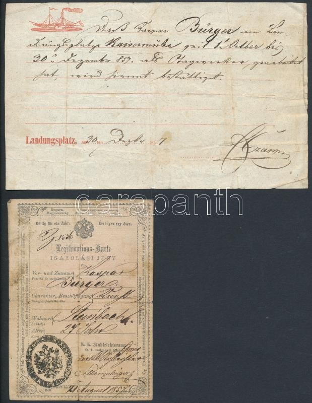 1857 Igazolási jegy és hajós munkaigazolás egyazon személy részére https://www.darabanth.com/de/297-Fernauktion/297.0/Andere-Sammelgebiete/Dokument~200019/1857-Igazolasi-jegy-es-hajos-munkaigazolas-egyazon-szemely-reszere~II1555538