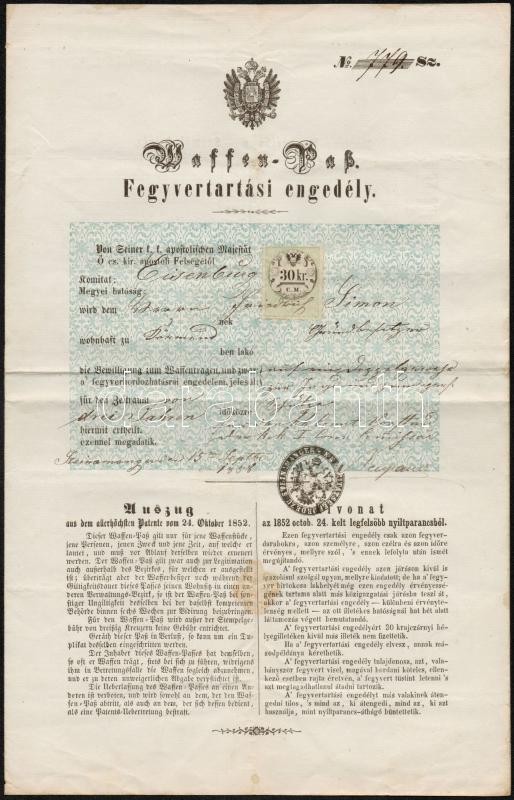 1858 Fegyvertartási engedély részére 30kr CM okmánybélyeggel / 1858 Wa... https://www.darabanth.com/de/297-Fernauktion/297.0/Andere-Sammelgebiete/Dokument~200019/1858-Fegyvertartasi-engedely-reszere-30kr-CM-okmanybelyeggel-1858-Waffen-Pass-Gun-licence~II1555664