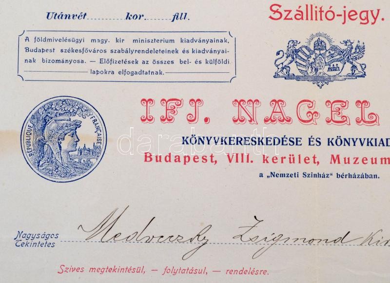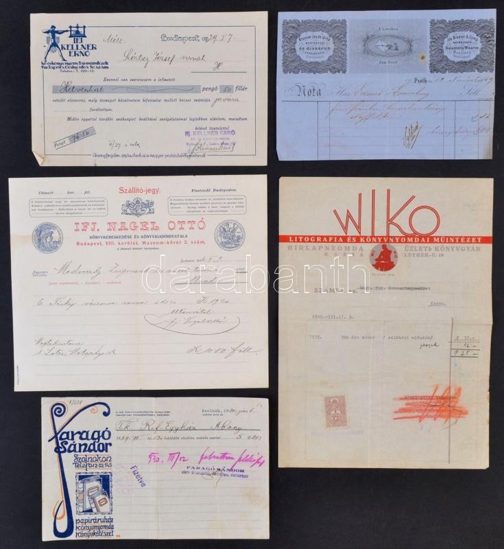 1859-1940 5 db régi fejléces számla (Brunner Jos és Társa Norinbergi és díszáruk kereksedése Bp., Ifj. Nagel Ottó Könyvkereskedése és Könyvkiadóhivatala Bp., Faragó Sándor Papíráruház, Könyvnyomda, Könyvkötészet Szolnok, Ifj. Kellner Ernő Kő- és Könyvnyomdai Műintézete Bp., Wiko Litografia és Könyvnyomdai Műintézet Kassa), 1 db 2 filléres okmánybélyeggel.