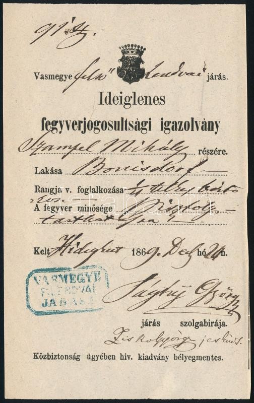 1869 Ideiglenes fegyverjogosultsági igazolvány bónisfalvai elöljáró ré... https://www.darabanth.com/de/297-Fernauktion/297.0/Andere-Sammelgebiete/Dokument~200019/1869-Ideiglenes-fegyverjogosultsagi-igazolvany-bonisfalvai-eloljaro-reszere-1869-Waffen-Pa~II1573104