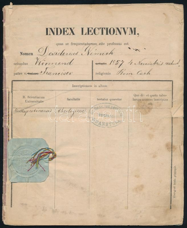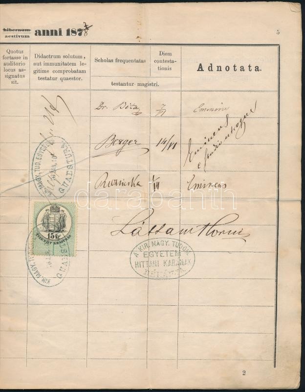 1878 Egyetemi leckekönyv latin nyelven, okmánybélyegekkel https://www.darabanth.com/de/297-Fernauktion/297.0/Andere-Sammelgebiete/Dokument~200019/1878-Egyetemi-leckekonyv-latin-nyelven-okmanybelyegekkel~II1590923