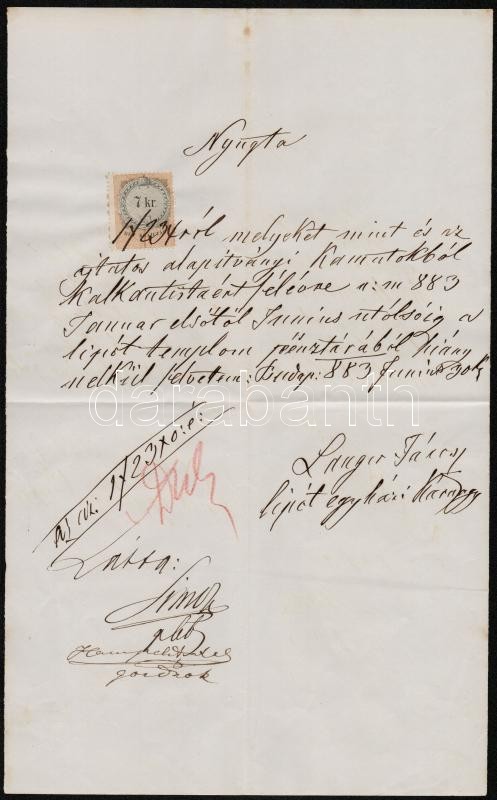 1883 Budapest Lipótvárosi Plébánia nyugtája, 7 kr. okmánybélyeggel, Langer János (1819-1889) zeneszerző, egyházi karnagy, Szent István-bazilika kántorának aláírásával