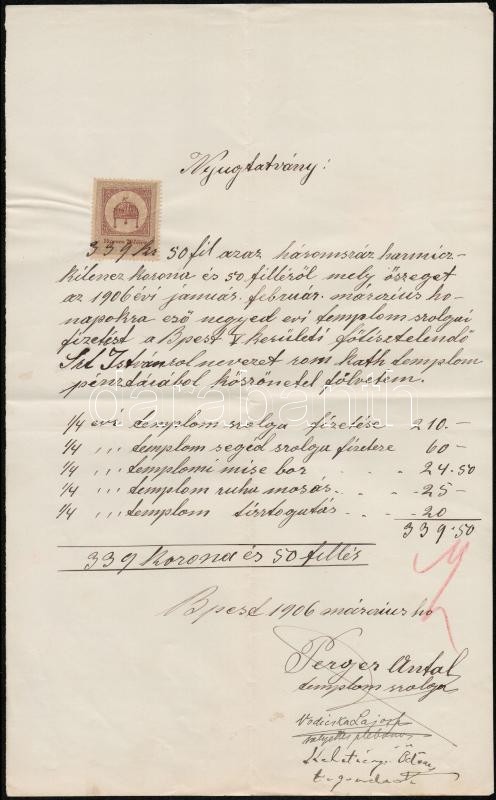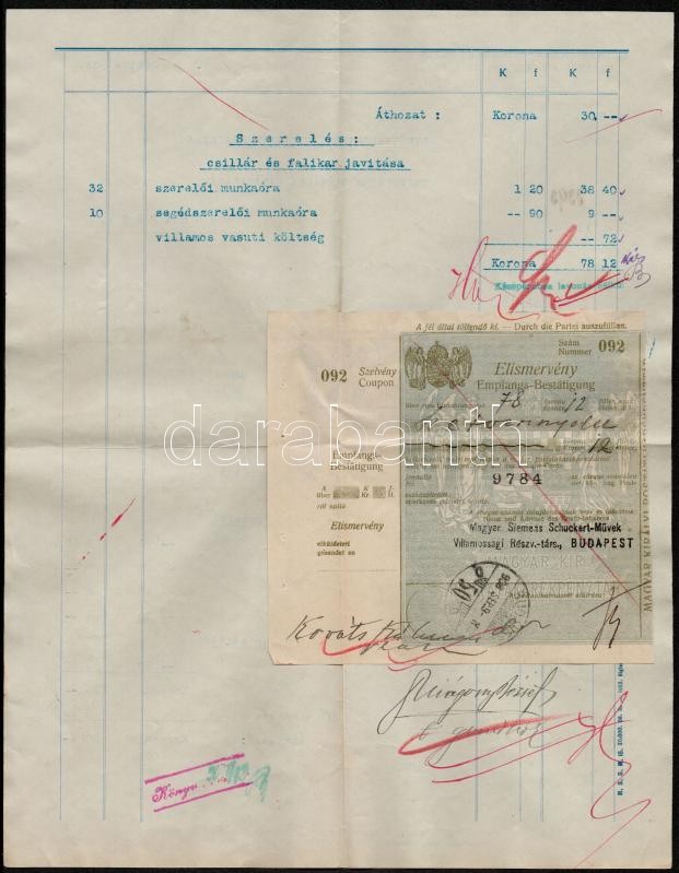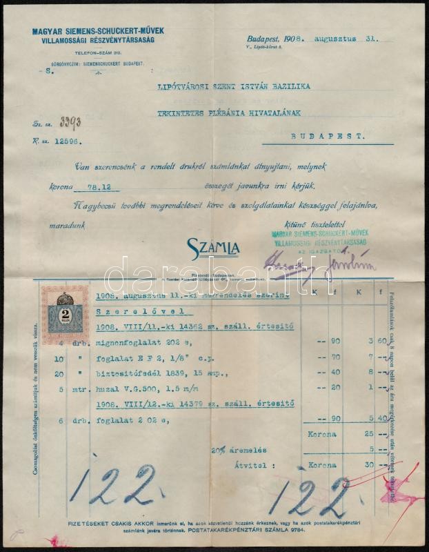 2 db Nyugta 64 f., 1 kr. 26f. okmánybélyegekkel, valamint Magyar Siemens-Scuckert Művek Villamossági Rt. számlája, 2 f. okmánybélyeggel, hátoldalára felragasztott elismervénnyel. A Szent István Bazilika részére kiállított számla, és nyugták.