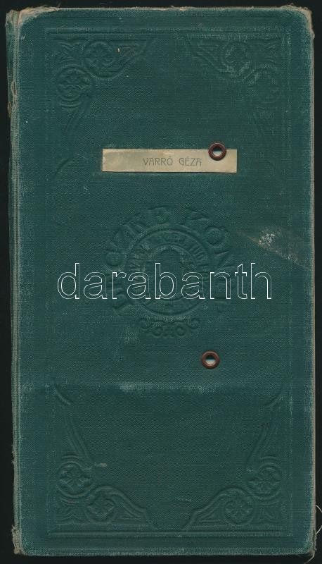 1906-1909 Kolozsvár, Magyar Királyi Ferenc József Tudományegyetem leckekönyve, joghallgató részére, az egyetem tanárainak (Óvári Kelemen, Böhm Károly, Kiss Mór, Balogh Arthur, Boér Elek, Szadeczky Lajos, Kosuthány Ignác...stb.), valamint az egyetem rektorainak (Moldován Gergely, Udránszky László) és dékánjainak (Kosuthány Ignác, Óvári Kelemen) aláírásaival, végbizonyítvánnyal, 2 db 2kr. 9 db 30f. okmánybélyegekkel, szárazpecséttel, kopottas egészvászonkötésben.