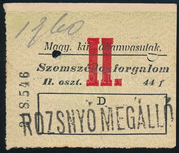 1907 Magyar Királyi Államvasutak által kibocsátott vasúti jegy, Rozsny... https://www.darabanth.com/de/297-Fernauktion/297.0/Andere-Sammelgebiete/Dokument~200019/1907-Magyar-Kiralyi-Allamvasutak-altal-kibocsatott-vasuti-jegy-Rozsnyo-megallo~II1586241