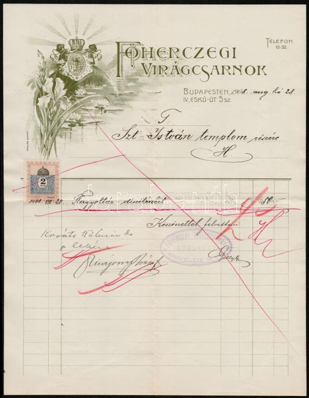 1908 Főhercegi virágcsarnok díszes fejléces számlája, hajtásnyomokkal,... https://www.darabanth.com/de/297-Fernauktion/297.0/Andere-Sammelgebiete/Dokument~200019/1908-Fohercegi-viragcsarnok-diszes-fejleces-szamlaja-hajtasnyomokkal-Szent-Istvan-Bazilika~II1590943