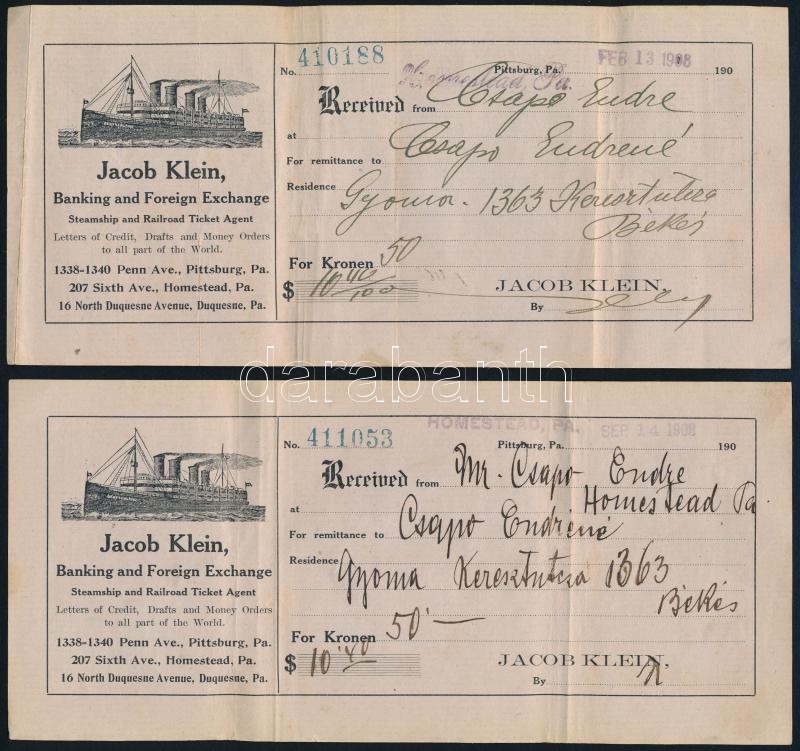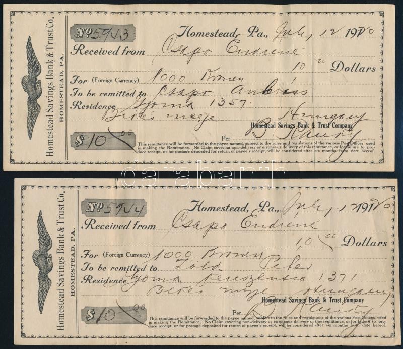 1910 Amerikába kivándorolt magyar által hazaküldött pénzösszegekről szóló csekkek 6 db / Cheques and money order sent home by Hungarian immigrant to USA