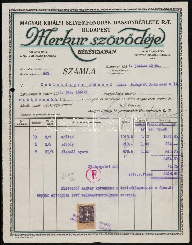 Beschreibung: 1923 Bp., A Magyar Királyi Selyemfonodák haszonbérlete R.T. Merkur szövödéje díszes fejléces számla illetékbélyeggel