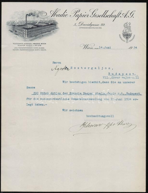 1924 Wien, Abadie-Papier Gesellschaft A.G. díszes fejléces levélpapírj... https://www.darabanth.com/de/297-Fernauktion/297.0/Andere-Sammelgebiete/Dokument~200019/1924-Wien-Abadie-Papier-Gesellschaft-AG-diszes-fejleces-levelpapirjara-irt-level~II1588813