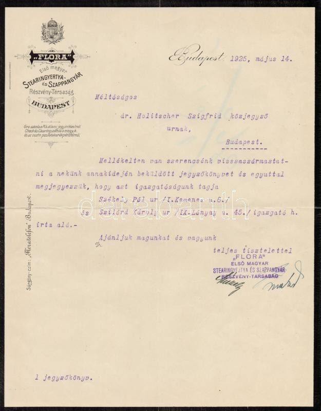 1925 Bp., Flora Első Magyar Stearingyertya- és Szappangyár Részvénytár... https://www.darabanth.com/de/297-Fernauktion/297.0/Andere-Sammelgebiete/Dokument~200019/1925-Bp-Flora-Elso-Magyar-Stearingyertya-es-Szappangyar-Reszvenytarsasag-fejleces-levelp~II1588790