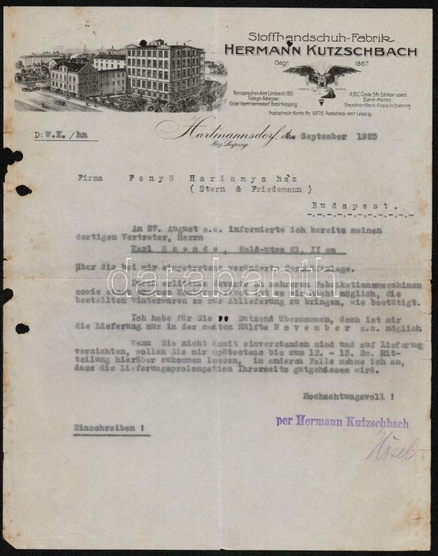 1925 Hartmannsdorf, Stoffhandschuh-Fabrik Hermann Kutzschbach fejléces... https://www.darabanth.com/de/297-Fernauktion/297.0/Andere-Sammelgebiete/Dokument~200019/1925-Hartmannsdorf-Stoffhandschuh-Fabrik-Hermann-Kutzschbach-fejleces-levelpapirjara-irt-leve~II1588828
