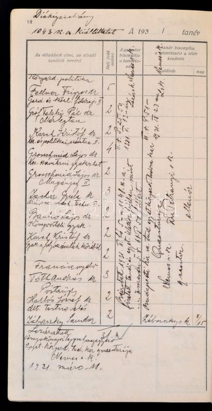 1936 Takácsy László a M. Kir. József Nádor Műszaki és Gazdaságtudományi Egyetem közgazdász hallgatójának leckekönyve, a kar dékánjának és tanárainak aláírásával, köztük gróf Teleki Pál (1879-1941), Fellner Frigyes (1871-1945)