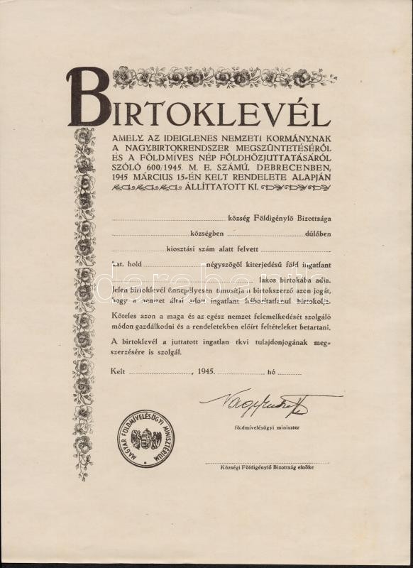 Beschreibung: 1945 Az Ideiglenes Nemzeti Kormány nagybirtokrendszer megszüntetésérÅ‘l szóló rendelete alapján kiadott birtoklevél, kitöltetlen, Nagy Imre földművelésügyi miniszer nyomtatott aláÃrásával, 32x23 cm