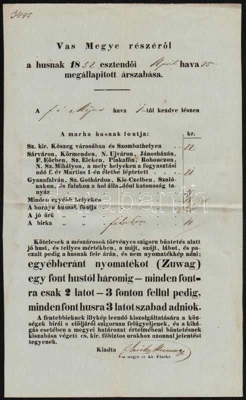 1852 Vas megyei magyar nyelvű húsárú hirdetmény https://www.darabanth.com/de/297-Fernauktion/297.0/Andere-Sammelgebiete/Drucksachen~200029/1852-Vas-megyei-magyar-nyelvu-husaru-hirdetmeny~II1581819