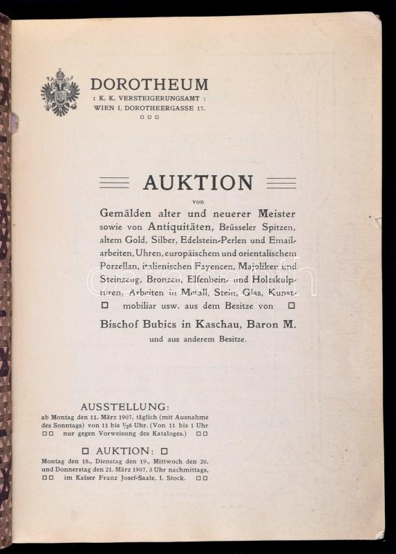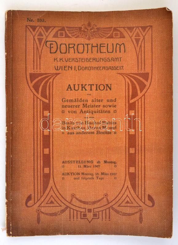 1907 Dorotheum aukciós katalógus. Wien, W. Hamburger-ny. Kiadói szecessziós papírkötés, kissé kopottas gerinccel, fekete-fehér fotókkal illusztrálva, magyar vonatkozásokkal, német nyelven./ 1907 Dorotheum auction catalogues. Wien, W. Hamburger-ny. Paperbinding, with little bit worn spine, with black and photographs, in German language.