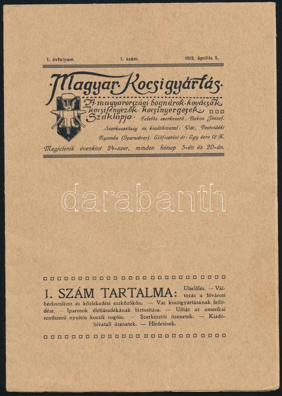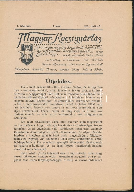 Beschreibung: 1912. Magyar kocsigyártás - A magyarországi bognárok kovácsok, kocsifényezők, kocsinyergesek szaklapja. Induló szám 16p. Sok hirdetéssel