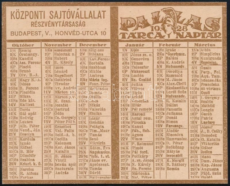 1928 Bp., Pallas Tárcanaptár, kiadja a Központi Sajtóvállalat Részvény... https://www.darabanth.com/de/297-Fernauktion/297.0/Andere-Sammelgebiete/Drucksachen~200029/1928-Bp-Pallas-Tarcanaptar-kiadja-a-Kozponti-Sajtovallalat-Reszvenytarsasag~II1586326