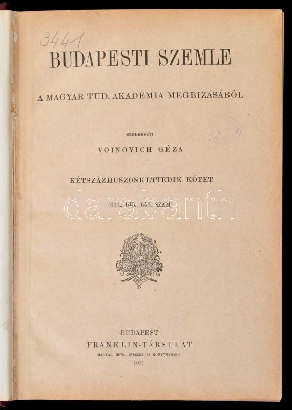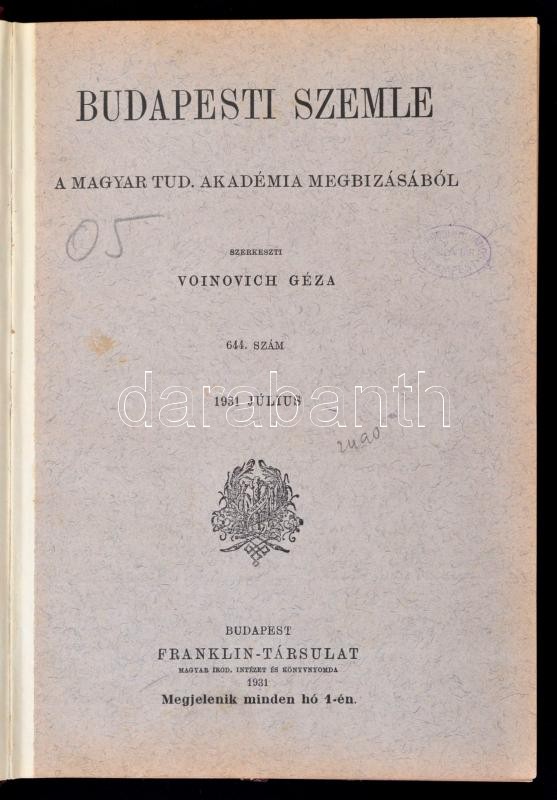 1931 Budapesti Szemle. Szerk.: Voinovich Géza. 1931. Július 644. szám. Bp., Franklin. Átkötött korabeli aranyozott félvászon-kötés, az eredeti papírborítót belekötötték. Jó állapotban.