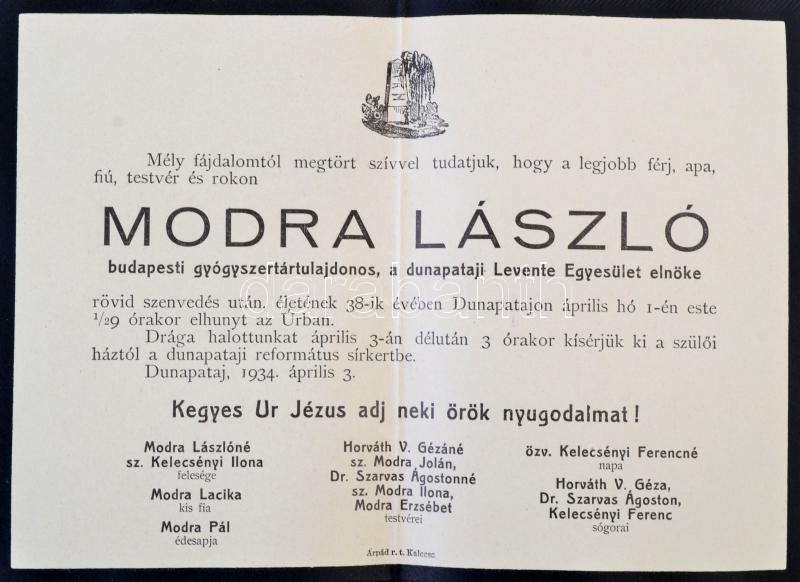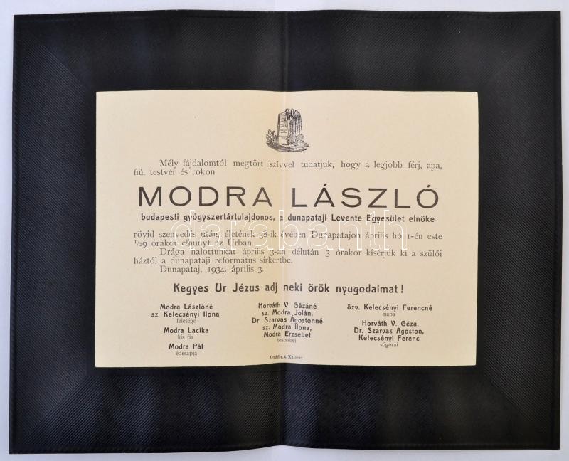Beschreibung: 1934 Modra László budapesti gyógyszertártulajdonos, dunapataji Levente Egyesület elnökének gyászjelentése, 23x29 cm