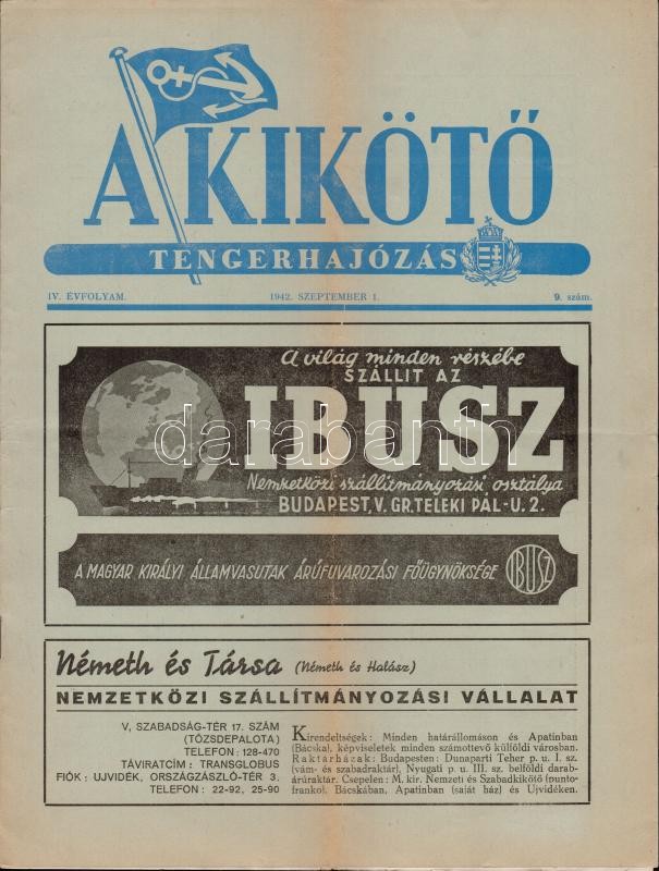 1942 A Kikötő c. hajós újság hajózási szaklap egy száma. https://www.darabanth.com/de/297-Fernauktion/297.0/Andere-Sammelgebiete/Drucksachen~200029/1942-A-Kikoto-c-hajos-ujsag-hajozasi-szaklap-egy-szama~II1582356