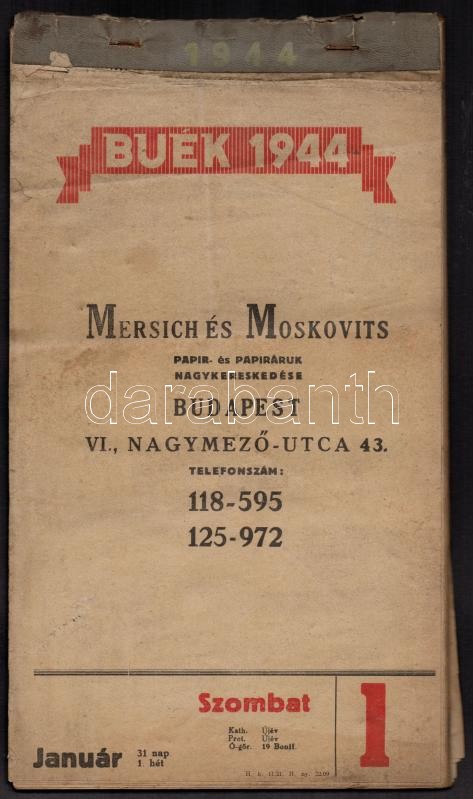 1944 Bp. VI., A Merisch és Moskovits Papír- és papíráruk nagykereskedé... https://www.darabanth.com/de/297-Fernauktion/297.0/Andere-Sammelgebiete/Drucksachen~200029/1944-Bp-VI-A-Merisch-es-Moskovits-Papir-es-papiraruk-nagykereskedesenek-naptara~II1586452