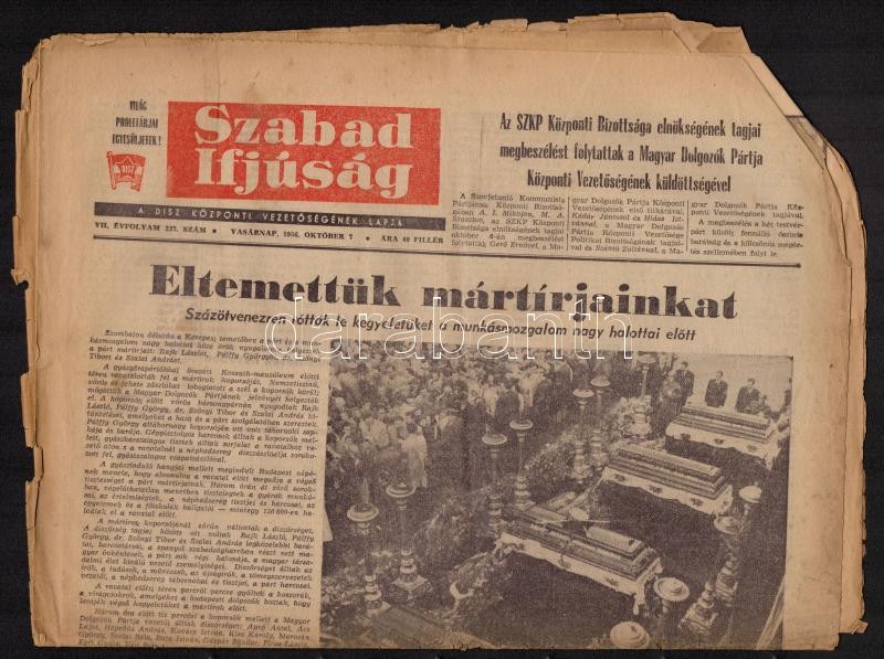 Beschreibung: 1956 A Szabad Ifjúság, a DISZ központi vezetőségének lapja, október 7-i száma, benne cikkek Rajk László és társai újratemetéséről