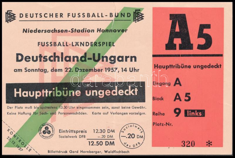 1957 Belépőjegy német-magyar labdarúgó mérkőzésre / Fussball-Länderspi... https://www.darabanth.com/de/297-Fernauktion/297.0/Andere-Sammelgebiete/Drucksachen~200029/1957-Belepojegy-nemet-magyar-labdarugo-merkozesre-Fussball-Landerspiel-Deutschland-Ungarn~II1420756