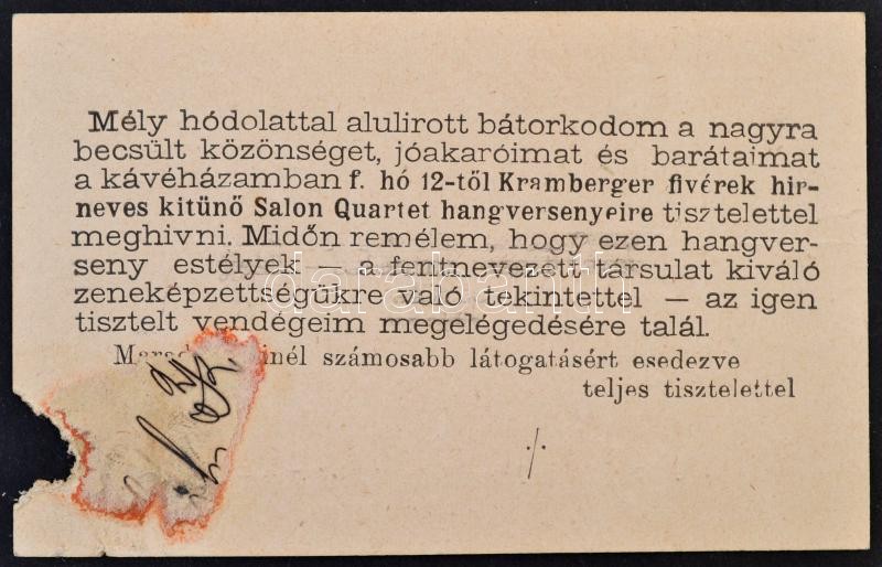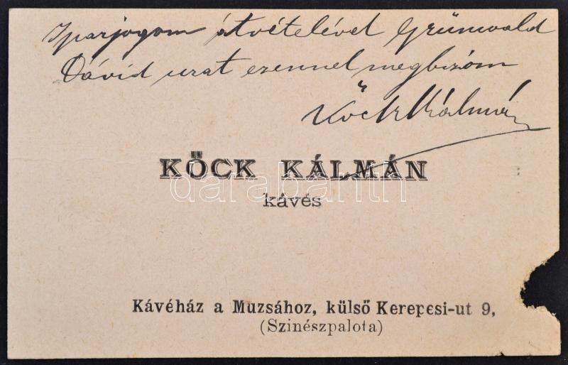 Beschreibung: cca 1910 Köck Kálmán, a Kávéház a Múzsához tulajdonosának névjegykártyája és meghívója, saját kezű soraival és aláírásával, szakadással, 7x11 cm