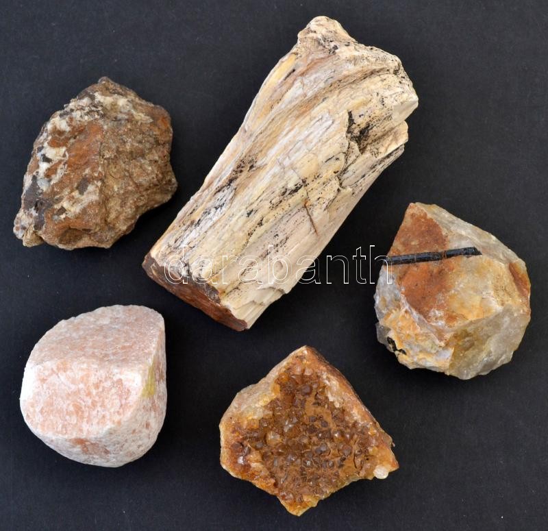 Beschreibung: 5 db különféle érdekes ásvány, köztük rózsakvarc, különböző méretben