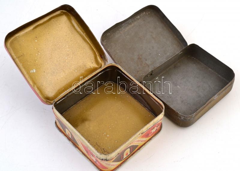 Beschreibung: Stühmer Kakaó fém henger alakú doboz, m: 21 cm, d: 12 cm + Békési Mézcukorka fém doboz, 7x7x3,5 cm + Carlo Erba Pastiglie fém dobozka, 7x6x2 cm