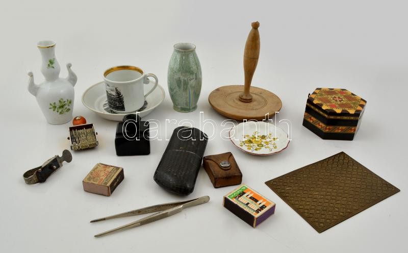 Beschreibung: Vegyes bolha tétel, 15 db különféle használati tárgy (pl: 1 db régi dátumbélyegző, 5 db régi porcelán, 1 db régi fadoboz, 2 régi gyufásdoboz, 1 db régi szemüvegtok..stb.), változó állapotban.